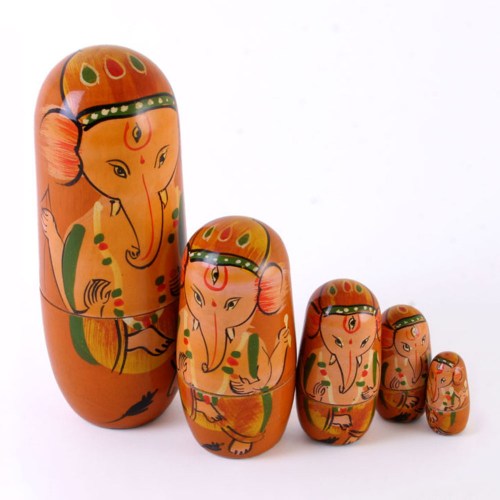 This set of 5 wooden nesting dolls is in a beautiful Ganesh design.